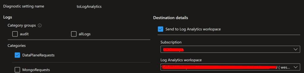 First, if this is not the case yet, let us enable Diagnostic settings on the Cosmos Account and let’s forward them to a Log Analytics Workspace. We will specifically enable the ‘DataPlaneRequests’ category: