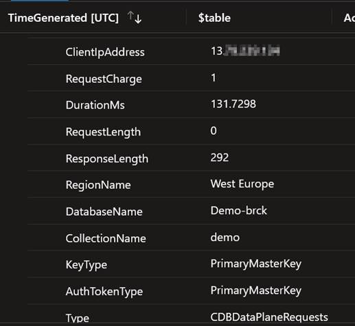 An example of a data plane action in the logs can give us a lot of information regarding which applications and users are using the access keys and Cosmos DB account. Some information we can find in the logs includes: